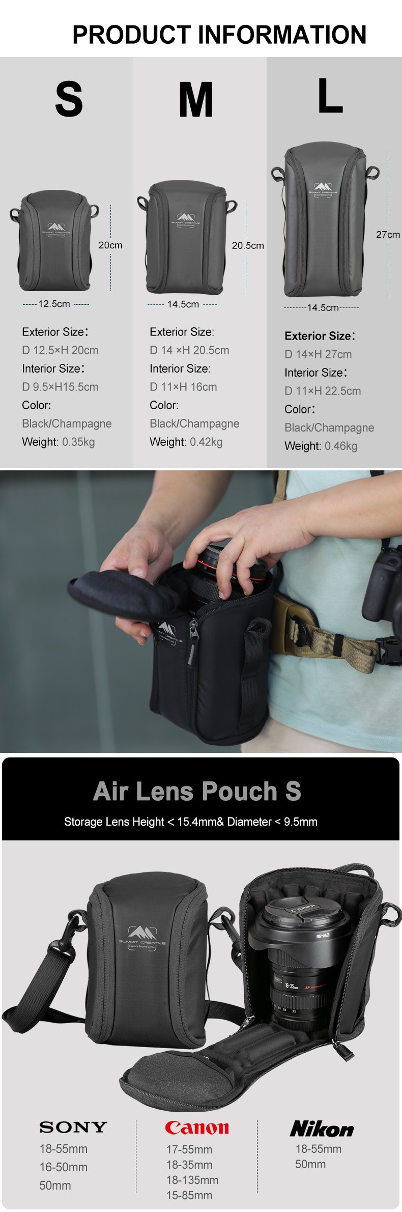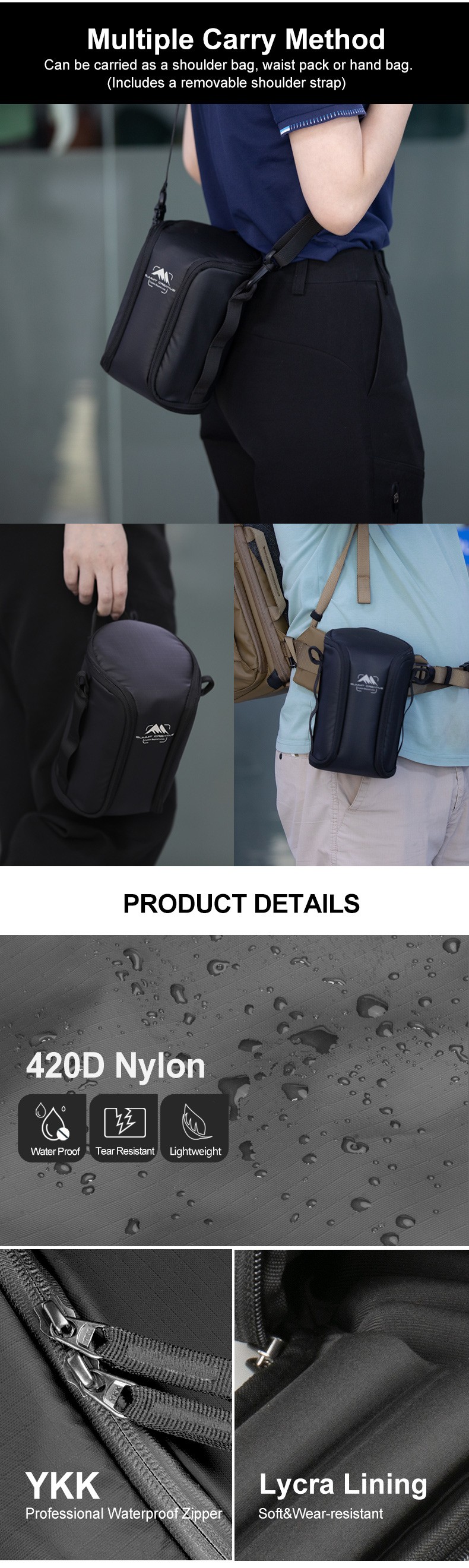 Can be carried as a shoulder bag, waist pack or hand bag.